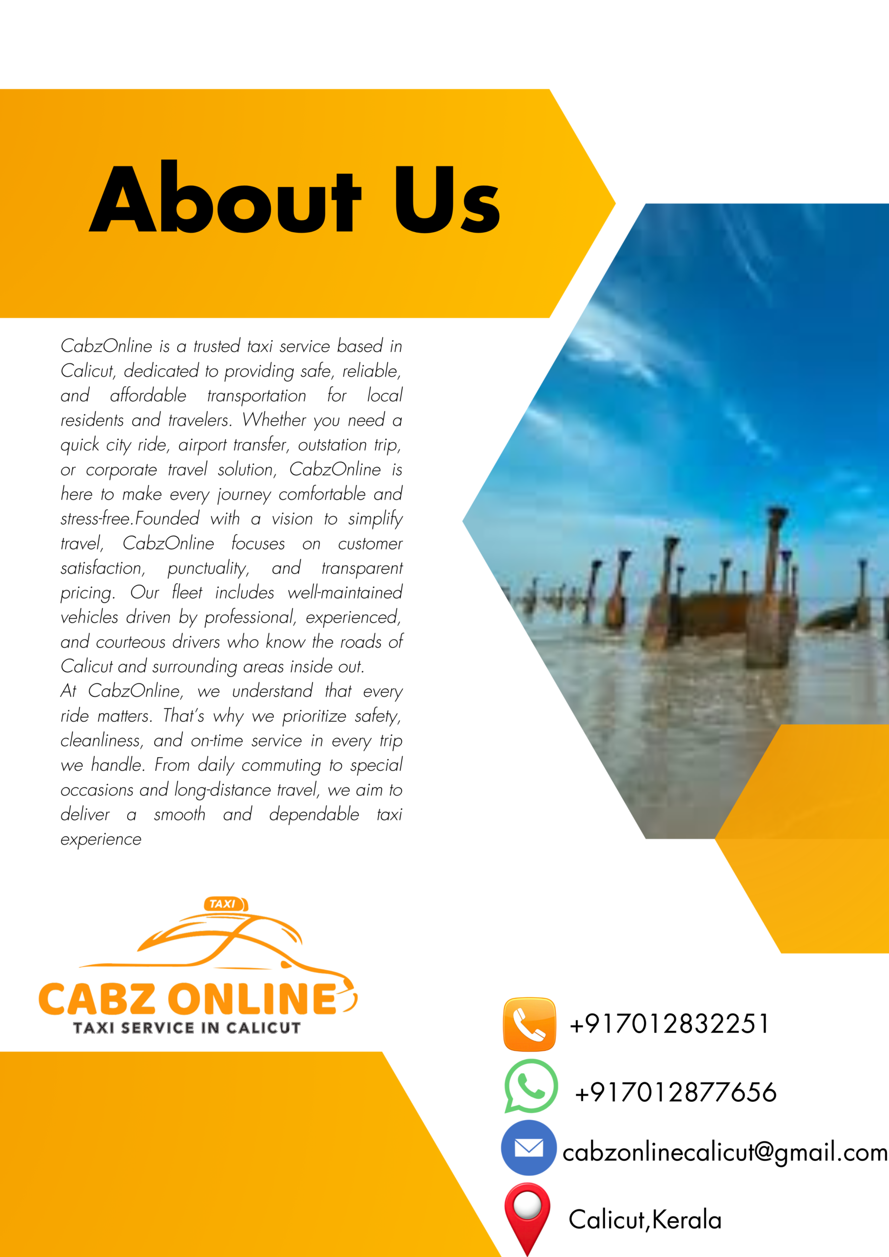 CabzOnline Taxi Service provides reliable, affordable, and 24/7 taxi services in Calicut (Kozhikode) and surrounding areas. We specialize in airport taxi services, railway station pickups, local city travel, and outstation cab services across Kerala. Our professional drivers, clean and well-maintained vehicles, and on-time service ensure a safe and comfortable journey every time. Whether you need a quick local ride or a long-distance trip, CabzOnline offers prompt booking and transparent pricing. Call or Whatsapp for instant taxi booking in Calicut and Kozhikode.